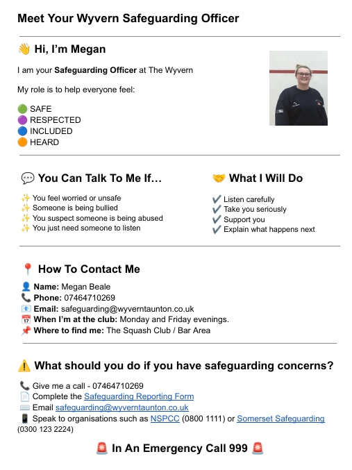 For any questions, please contact Megan Beale (The Wyvern Safeguarding Officer & Paramedic PA056060) on 07464710269 or via email safeguarding@wyverntaunton.co.uk